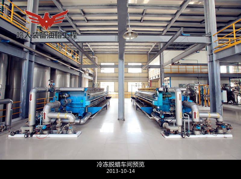 低溫脫蠟即單靠冷凍結(jié)晶,然后用機(jī)械方法分離油、蠟而不加任何輔助劑和輔助手段的脫蠟方法。分離時(shí)采用加壓過(guò)濾、真空過(guò)濾和離心分離等設(shè)備。此法**簡(jiǎn)單的是一次結(jié)晶、過(guò)濾法。將脫臭后的油脂(溫度在 50℃以上)移入有冷卻裝置的結(jié)晶養(yǎng)晶罐,慢速攪拌,在常壓下充分冷卻,整個(gè)冷卻結(jié)晶時(shí)間為48h,然后過(guò)濾分離油、蠟質(zhì)。過(guò)濾壓強(qiáng)維持在 0.3–0.35MPa,過(guò)濾后要及時(shí)用壓縮空氣吹出蠟中夾帶的油脂,濾出的油即為脫蠟成品油。